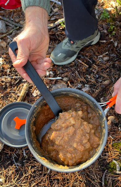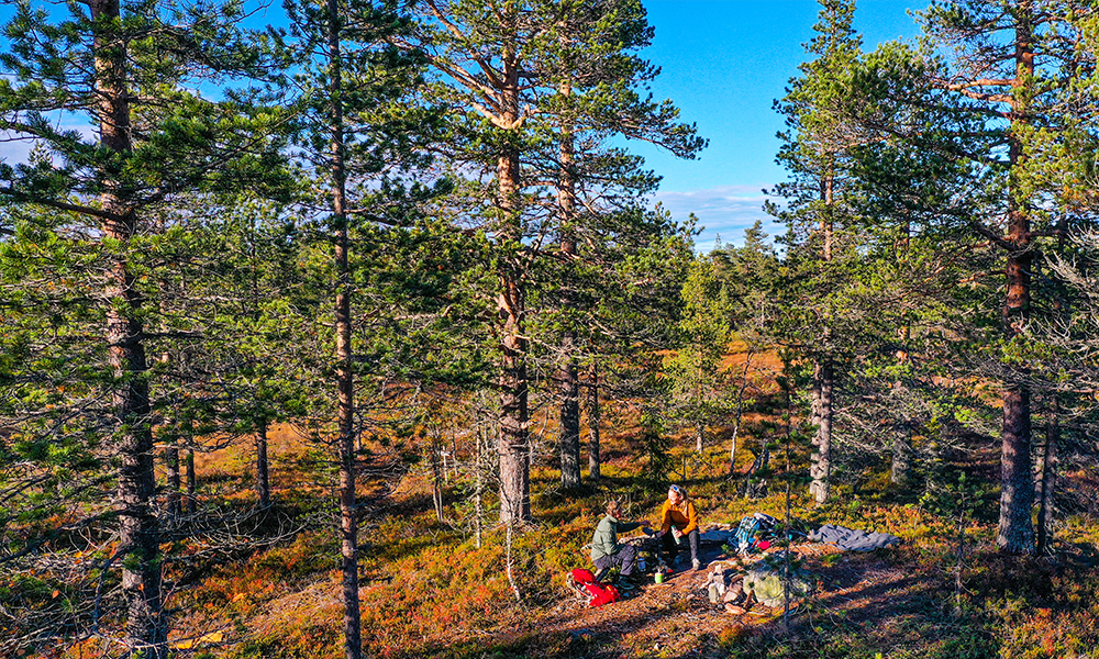 Da vi finner en nydelig leirplass under en time fra start på vår fottur på Hedmarkdsvidda, blir fristelsen for stor. Dette blir første stopp. Plassen ligger på en bitteliten forhøyning, med ferdig oppsatt bålplass og stokker til benker. Bikkja velter seg ned i lyngen og tar en pustepause mens vi drikker kaffe og lager lunsj på primus. Noen har til og med klart å snike både Kvikk Lunsj og appelsin ned i sekken. Friluftslivets små gleder; raste, ikke haste.