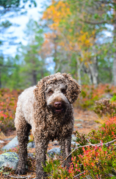 Bakken er dekket av fargesprakende blåbærlyng, irrgrønn fjærmose og klassisk furumose – du vet, den som ser ut som greina på en furu. Underlaget er så mykt at det fjærer når vi går, og det føles nesten som vi spretter bortover stien. Så blir vi nok også godt hjulpet av at det knapt er stigning, dette er flat vidde og det høyeste punktet på turen er mindre enn 50 høydemetre over startpunktet.