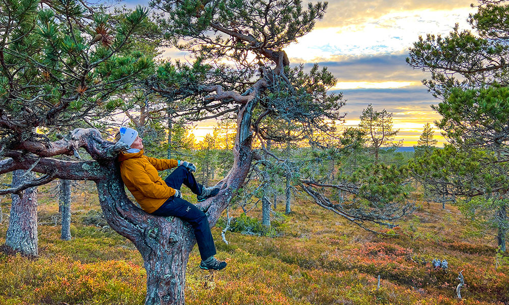 Bua er omkranset av kortvokste, snodige furutrær, med bare et par meter høy stamme som gjerne deler seg i to eller tre forgreininger som kronen på en hjort. Jeg klyver opp en stamme, slenger beina på en grein, lener meg tilbake og nyter solen som akkurat synker ned under horisonten. Blink!