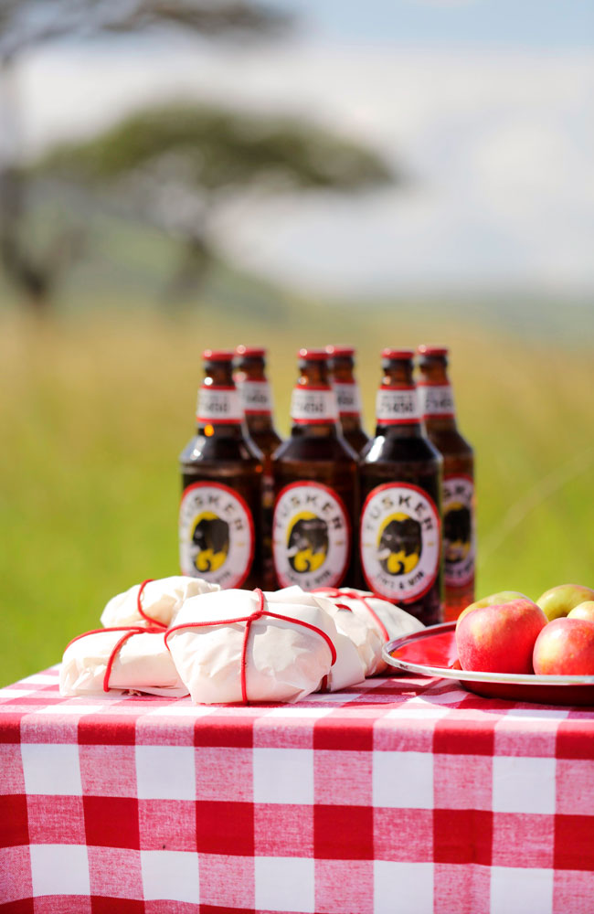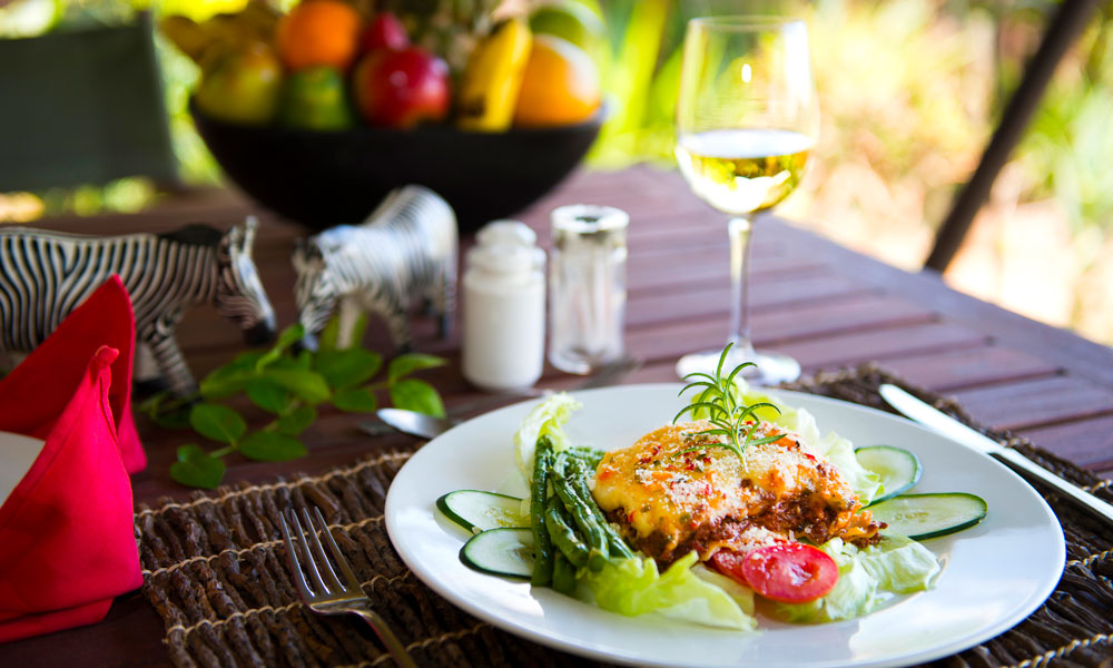 Kjøkkensjef Ibrahim Metjeka står bak grillen i hvit kokkedrakt med sebrastriper i linningene. Han griller lam, biff og pølser. På buffetbordet står spennende salater, ris og den lokale spesialiteten «ugali» – en slags maismelstuing som er lagd for å mette. Restauranten er full av levende lys, som lager en lun stemning for en helkveld i den afrikanske bushen.