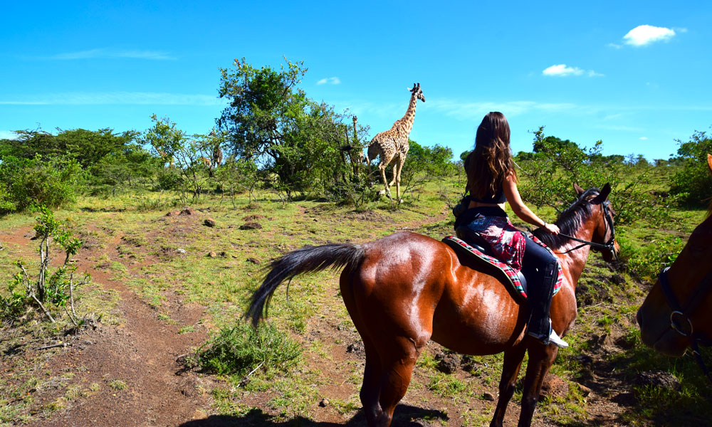 På safari fra hesteryggen er det heldigvis sjelden man møter en løve. Istedet møter man snille dyr som sjiraffer og geiter. Foto: Mari Bareksten