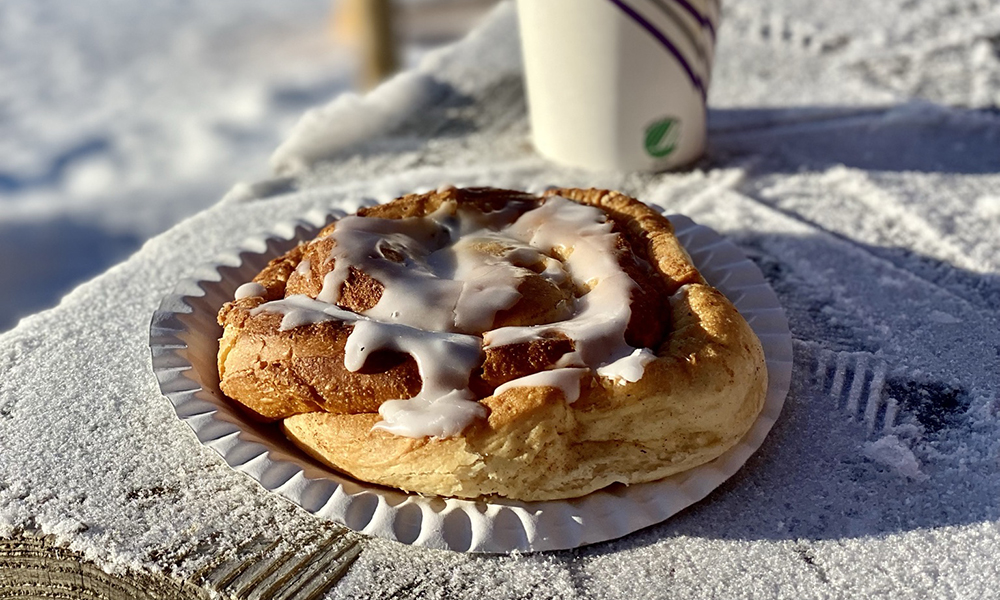– Det er jo greia her, å gå fra Budor og hit for å spise bolle, og så kjøre ned igjen, sier Knut og serverer en rykende fersk kanelbolle.