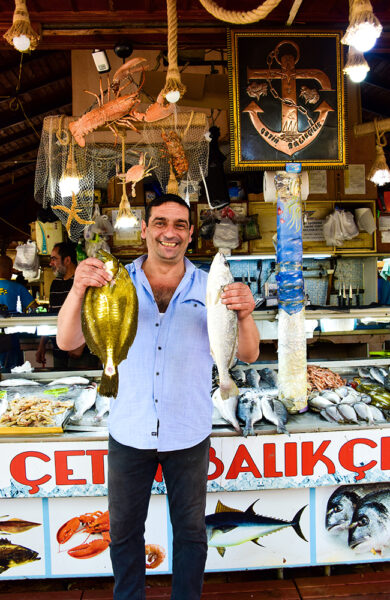 Innehaveren av Cetin Balikcilik fiskebutikk – en av flere som ligger sentrert i midten av Fethyes attraktive fiskemarked – holder opp en fersk fisk i hver hånd, rett opp av havet utenfor. I disken hans ligger deler av dagens fangst, og underveis lempes det på med mer av havets delikatesser fra nyankomne kasser.