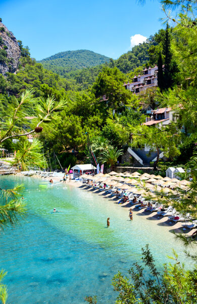 Og det er de ikke alene om – Butterfly Valley er et av høydepunktene langs kysten, berømt på grunn av den trange, gylne stranden og de dramatiske omgivelsene. Men sannheten er at den verken er unik eller alene. Hele «Tyrkias turkise kyst» – som løselig strekker seg fra Kas i syd til forbi Fethiye langs den Den lykiske halvøy – er pepret med vakre bukter med silkemyke strender, der pinjedekte fjellsider ramler ned i et batikkteppe av grønt, turkist og blått. Dette er Tyrkias svar på Maldivene. Året før korona stengte ned verden var et entusiastisk crew fra CNN travel på besøk langs Tyrkias turkise kyst, og proklamerte det raskt «den neste hotspoten ved sjøen». For anledningen har vi tatt bolig i en av dem. Hillside Beach Club ligger helt alene i den avsidesliggende Kalemyabukten utenfor byen Fethiye, innhyllet av grønne åser dekket av nåletrær. Hit kommer man ikke ved en tilfeldighet.