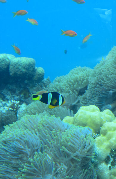 Allerede før servitøren har vist oss til bords, har vi sett utallige fisk i alle regnbuens farger. I tillegg til et glass champagne får vi også utdelt et kart med bilder og navn på fiskeartene som til vanlig dukker opp rundt restauranten – fra sommerfuglfisk til klovnefisk. Er man ekstra heldig svømmer også skilpadder, djevelrokker og hai forbi de buede og spesialkonstruerte glassvinduene. Det finnes i dag seks undervannsrestauranter på Maldivene, men den hos Hurawalhi er verdens største bygget i sin helhet av glass. Her er det lett å trives som fisken i vannet.