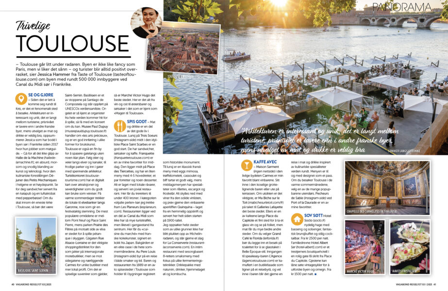 I tillegg får du omtaler av splitter ny reiselitteratur, et glimt av Eivind Hellstrøms kulinariske reiser, innsidertips til en undervurdert storby i Frankrike, intervju med kokebokforfatter Vidar Bergum, reisenyheter, trender, tips – og mye mer.