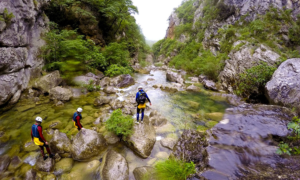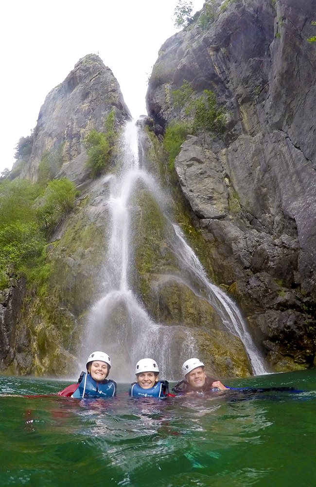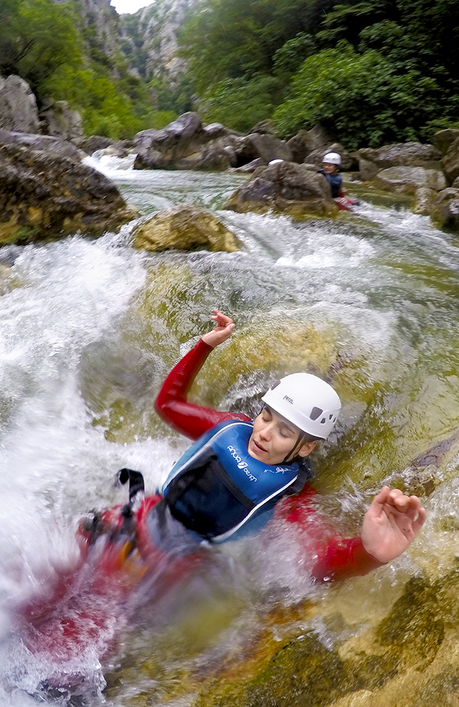 Steinene er sleipe, og strømmen i vannet tidvis sterk, men det går overraskende fort å bli vant til rytmen. Utstyrt med både hjelm, redningsvest og «plastbleie» for å skli bedre på steinene, kjennes det også trygt å suse nedover elven. Av og til må vi svømme over naturlige «basseng», andre ganger er det best å rutsje ned små fosser. Innimellom tar vi snarveien gjennom huler i fjellet, eller hopper fra fjellsidene. Her gjelder det å følge vannets bevegelser og nyte den urørte naturen.