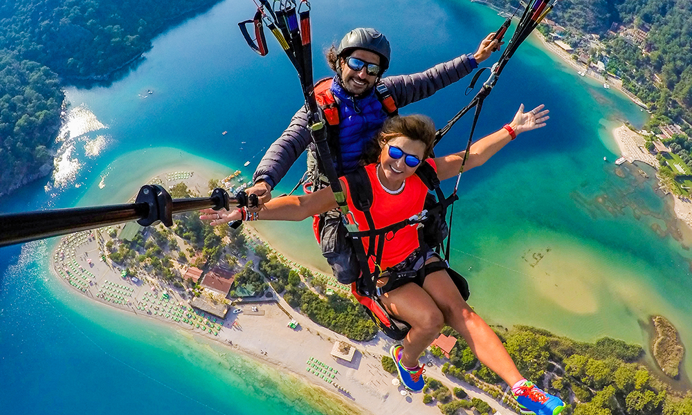 Rundturen fortsetter til paragliderstranden Olüdeniz, Tyrkias mest fotograferte strand. Vakker, og veldig travel. Folk ligger som sild i tønne på den tynne strandtunga, inne i sentrum er barene åpne til langt på natt, og gatene er proppfulle av høylytt ungdom. Olüdeniz er vakker – men best på avstand. Alternativt som base for opplevelser. For 1000 kroner får du et uforglemmelig hopp i en tandem paraglider fra utgangspunktet 2000 meter over havet. Med på kjøpet får du nydelig utsikt over den berømte stranden, et skikkelig adrenalinkick og et minne for livet. Gode forhold med stabile vinder gjør paragliding til byens mest populære aktivitet og på gode dager kan du kontinuerlig se et titalls fargerike skjermer som daler i luften.
