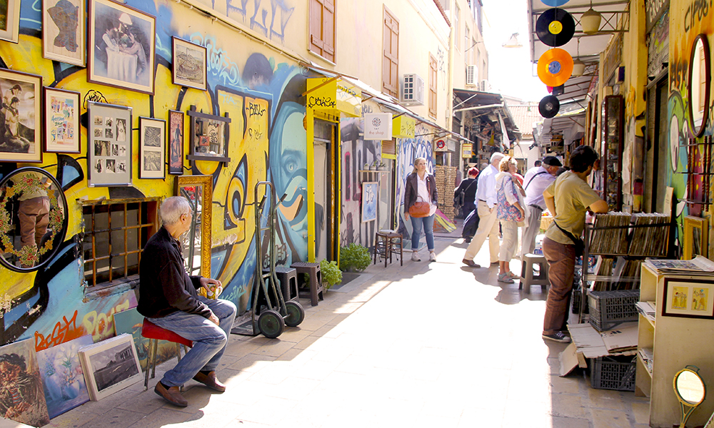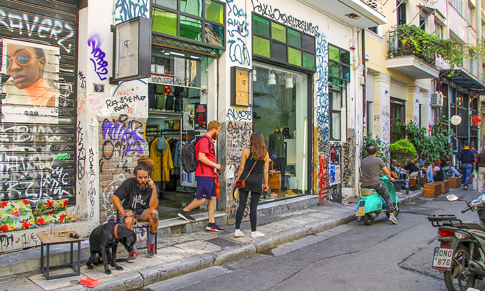 Det ligger vegg i vegg med Monastiraki, men igjen endrer atmosfæren seg betraktelig. Stemningen er vibrerende, det finnes knapt en vegg uten fargerik graffiti. Hippe boutiquebutikker ligger side om side med barberersjapper og tradisjonelle tavernaer.