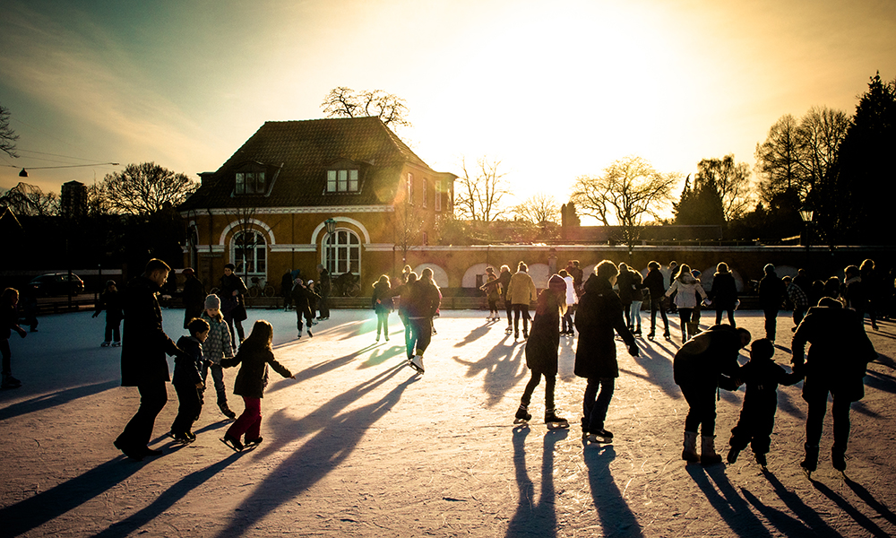 Du finner skøytebaner mange steder i København om vinteren. Den koseligste ligger i Frederiksberg Have, men den kuleste ligger her på Broens Skøjtebane, nesten midt i sentrum.