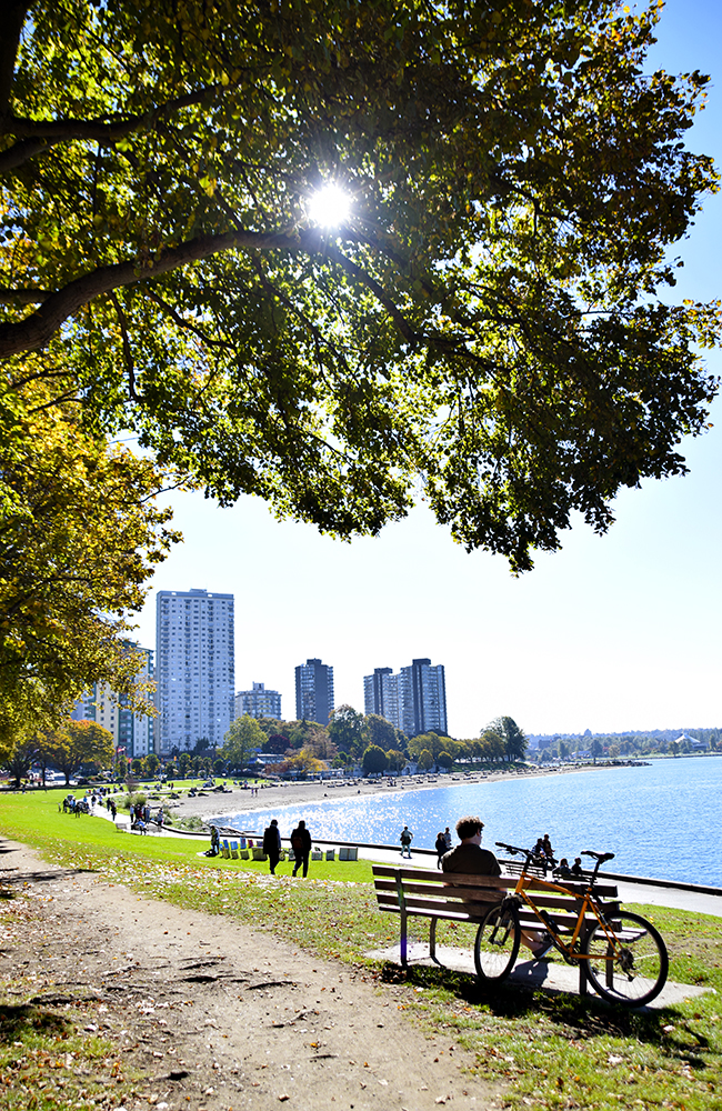 Vancouver har flere fine strender, og English Bay er en av dem. Ha piknik på gressletta eller nyt solen på en benk. Det er også et ypperlig sted å se solnedgangen. Foto: Mari Bareksten