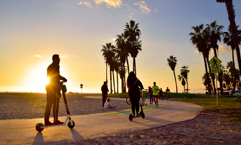 Langs byens strandlinje strekker det seg en 35 kilometer lang asfaltert sykkelsti, kalt «The Strand». Dermed er det veldig enkelt for turister å utforske byens kyst – enten på rulleskøyter, fra sykkelsetet eller på en av de nye elektriske sparkesyklene som har erobret Los Angeles.