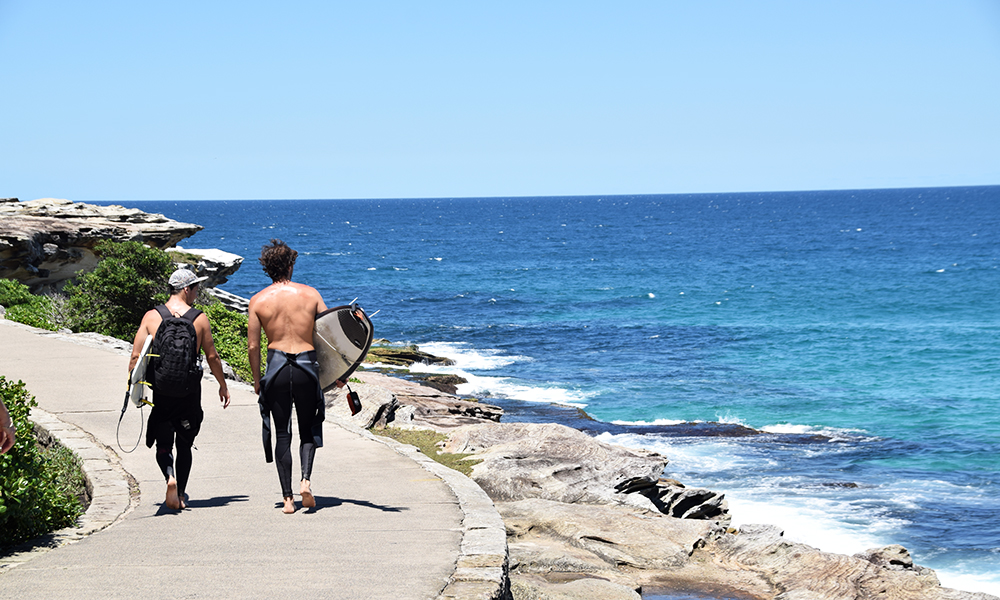 På Bondi Beach, kystvandringens siste stopp, er kroppsfokuset ekstra tydelig. Trente kropper jogger frem og tilbake på den om lag én kilometer lange stranden, et titalls surfere sitter på brettene sine og venter på den perfekte bølgen, mens andre flekser musklene sine på utendørshelsestudioet nord på stranden.