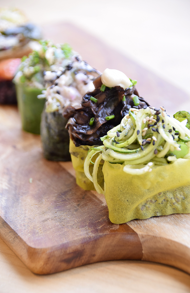 Han setter en trefjøl fremfor oss med noe som ligner på syv sushibiter, men fisken er byttet ut med ingredienser som valnøtter, søtpotet, tang, vannmelon, squash og tofu.