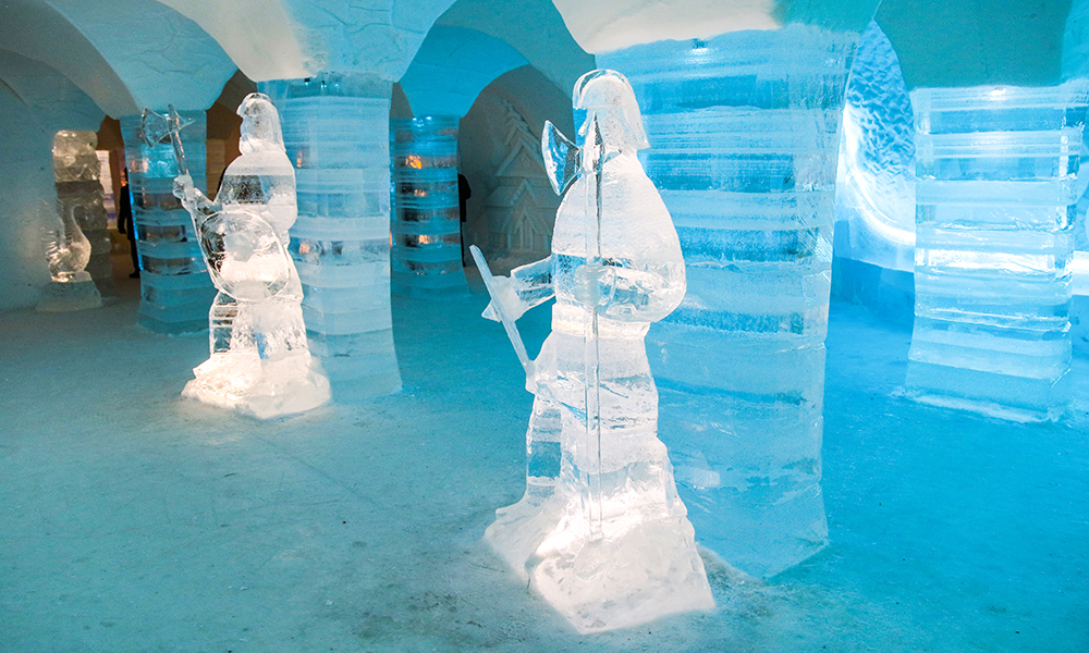 Fra baren serveres blå likør i glass av is, mens vann i frossen form danner alt fra sengegavler til sofakroker og skulpturer – alle med intrikate norrøne mønster skåret ut i isen.