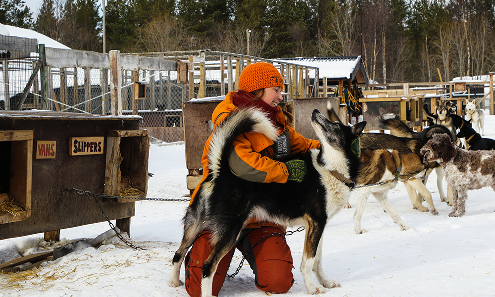 Jeg drar til Trasti & Trine på motsatt side av Altaelva, et par kilometer unna ishotellet, som frister med kombinasjonen av hundesledeturer på vidda og kortreist mat. 60 ivrige trekkhunder bjeffer i hundegården, alle vil på tur. Et halvt dusin av dem får seletøy, og kobles på en slede. Lyden av forventning, sjalusi og iver drønner gjennom dalen. Så er vi klare, porten åpnes, og det blir fullstendig stille mens den firbeinte sekstetten stormer ut i skogen og mot Altaelvas frosne aveny.